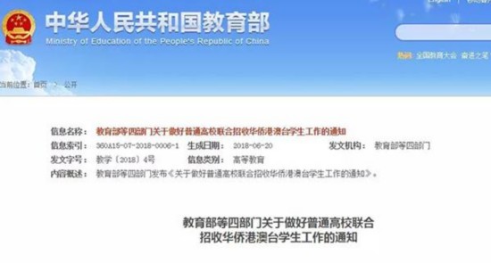 教育部说,今年,教育部会同外交部、公安部、国务院侨务办公室在广泛调研的基础上,对当前华侨港澳台招生工作报名条件、资格审核、考录程序、入学培养等方面进行了调整和完善,出台了《教育部等四部门关于做好普通高校联合招收华侨港澳台学生工作的通知》,以进一步规范招生录取工作,切实维护广大华侨和港澳台考生的合法权益。