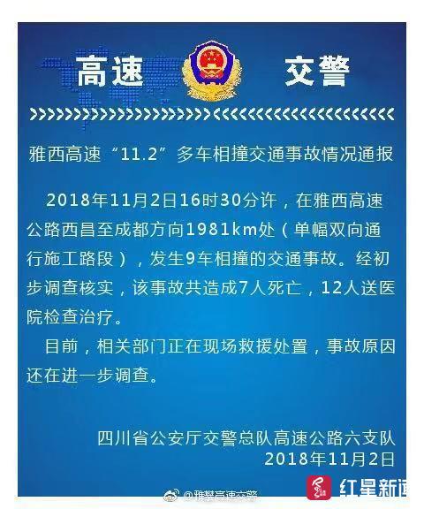 2018年11月2日16时30分许,在雅西高速公路西昌至成都方向1981km处(单幅双向通行施工路段),发生9车相撞的交通事故。经初步调查核实,该事故共造成7人死亡,12人送医院检查治疗。