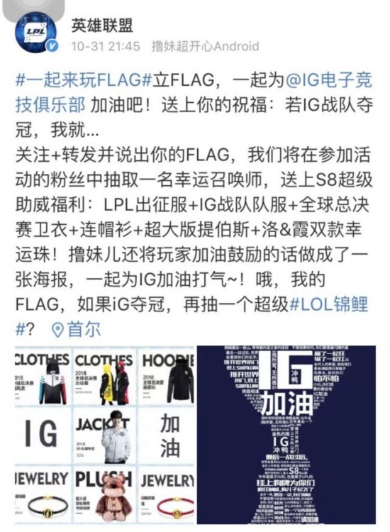 腾讯体育11月3日讯 英雄联盟2018全球总决赛终迎冠军角逐战,“莽王之王”iG再度展现出王者之风,以3场的出色发挥零封强敌FNC获得冠军创新历史!赛前为助力iG夺冠,网友们纷纷立下Flag,内容千奇百怪搞笑十足。