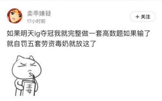 卖乖嫌疑:如果明天iG夺冠我就完整做一套高数题如果输了就自罚五套。