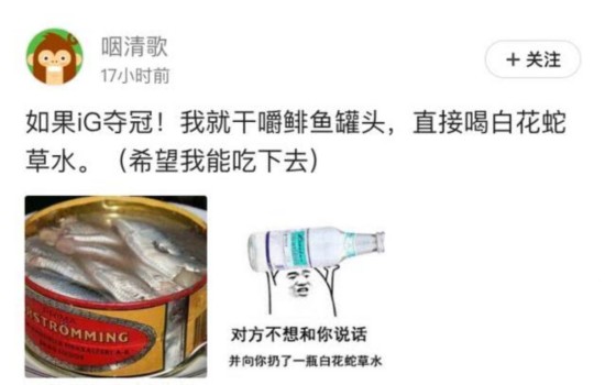 咽清歌:如果iG夺冠,我就干嚼鲱鱼罐头,直接喝白花蛇草水!(希望我能吃得下去)