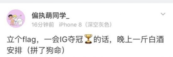 偏执萌同学_:立个Flag,一会iG夺冠的话,晚上一斤白酒安排!(拼了狗命)