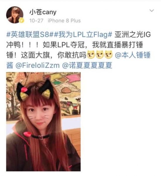 小苍cany:亚洲之光iG冲鸭!如果LPL夺冠,我就直播暴打锤锤!