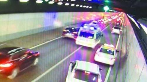 此后,隧道内两股车道上的所有车辆如同拉链一样,在救护车快要经过时“打开”通道,等待救护车离开后合拢,没有车抢行,直至救护车离开。