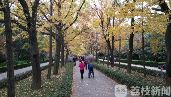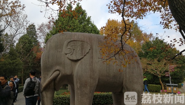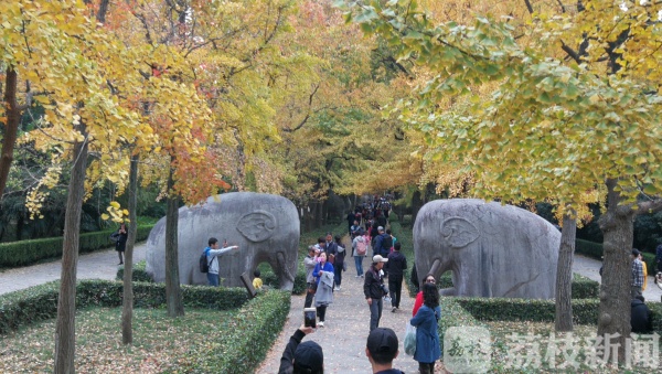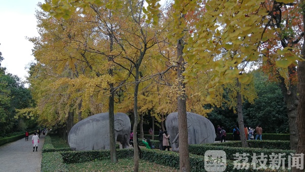 在两对石象这一段,我们看到此刻已经围了很多人,每个人都在把这最美秋色留在相册里,看来,这二对大象已经成了这个秋日南京的一处“网红打卡点”了。