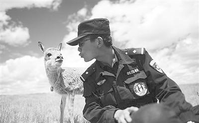 可可西里索南达杰保护站协警解安程在站内救护中心陪小藏羚羊玩耍。