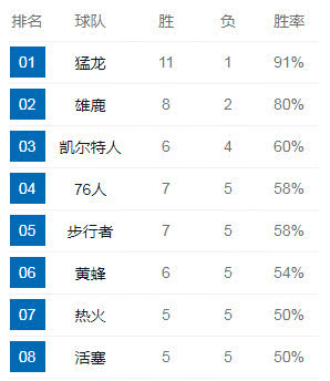 东部联盟球队排行榜