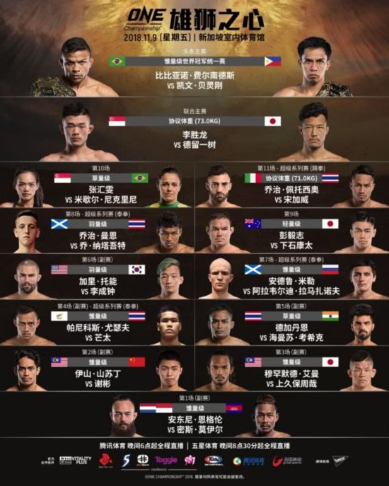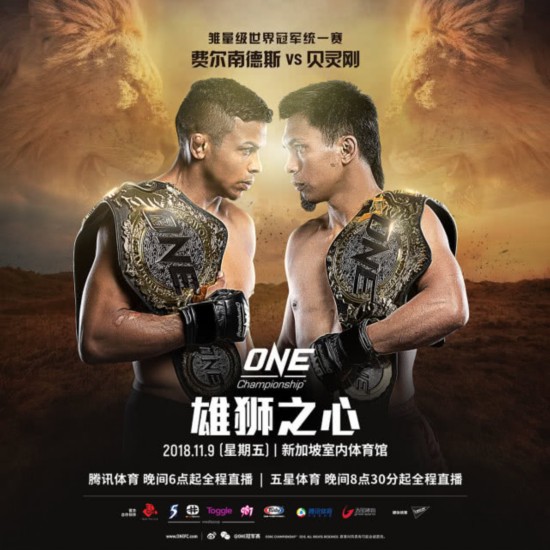 腾讯体育讯 每一次重回大本营新加坡举办比赛,ONE冠军赛的对阵卡都不会让拳迷失望,本站比赛将带来13场诚意满满的对决,囊括了9场MMA比赛、3场泰拳超级系列赛、1场踢拳超级系列赛,色香俱全的“格斗大乱炖”套餐满足各类粉丝的观赛需求,以比比亚诺-费尔南德斯和凯文-贝灵刚领衔的雏量级冠军统一战为首的6场焦点对阵。