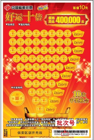 每一张即开型刮刮乐福利彩票均有一组对应的生产批次号码,批次号码位置一般位于彩票正面物流码处或者彩票背面下方。彩民朋友可通过生产批次号码判断所持彩票是否属于停售范围内的彩票。如下图所示“好运十倍”彩票,其生产批次号码为“13050”,说明其印制年份为2013年,属于停售范围内的彩票。