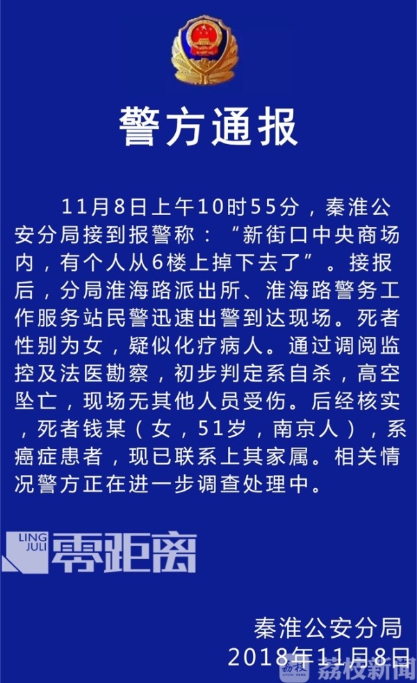 今天(11月8日)上午,有传言称南京中央商场有人坠楼,且砸死了一个一楼的化妆品导购员。