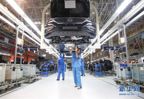 在位于嘉定的上汽大众生产车间内,工作人员在生产线上安装汽车底盘(10月30日摄)。 新华社记者 丁汀 摄