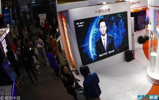 新华社联合搜狗7日在第五届世界互联网大会上发布全球首个合成新闻主播——“AI合成主播”,运用最新人工智能技术,“克隆”出与真人主播拥有同样播报能力的“分身”。这不仅在全球AI合成领域实现了技术创新和突破,更是在新闻领域开创了实时音视频与AI真人形象合成的先河。图据视觉中国