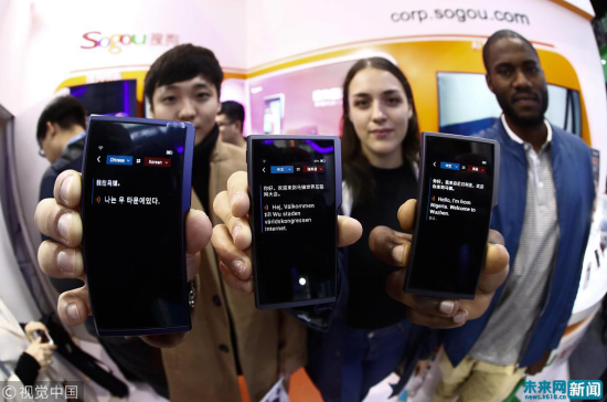 在浙江乌镇举行的第五届世界互联网大会“互联网之光”博览会会场内,中外与会嘉宾体验搜狗翻译宝Pro。它支持42种语言的在线语音翻译,采用了全球独创的神经网络机器翻译技术以及基于新版NMT技术研发的离线神经机器翻译技术。图据视觉中国