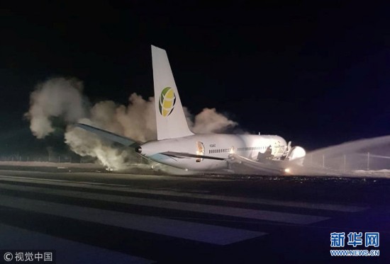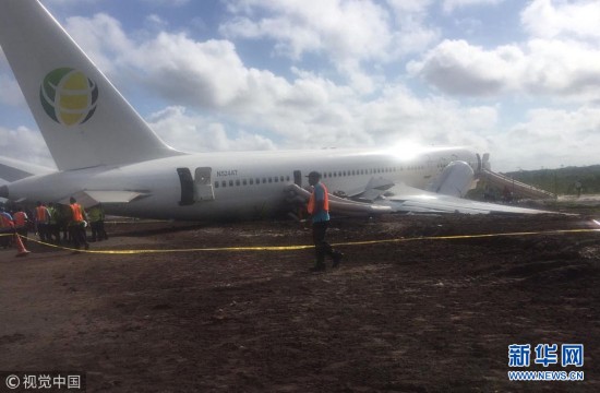 当地时间11月9日,圭亚那乔治敦切迪贾根国际机场,一架波音飞机在圭亚那机场紧急着陆时冲出跑道,6人受伤。(图片来源:视觉中国)