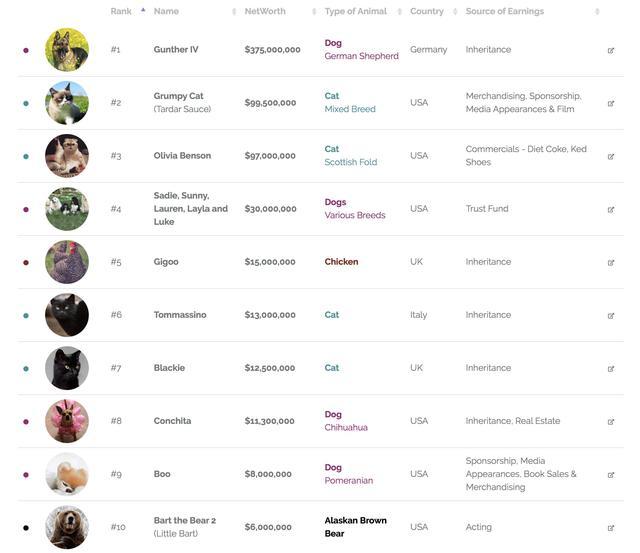 一只名叫“叽咕”的母鸡排在榜单第五位,身家1500万美元(1.04亿元人民币)。
