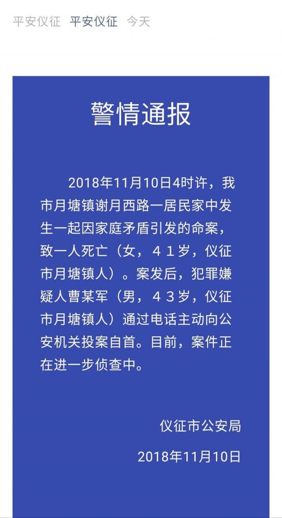 11月10日中午,江苏扬州仪征市公安局微信公众号发布一起命案警情,一男杀妻后向警方主动投案自首。