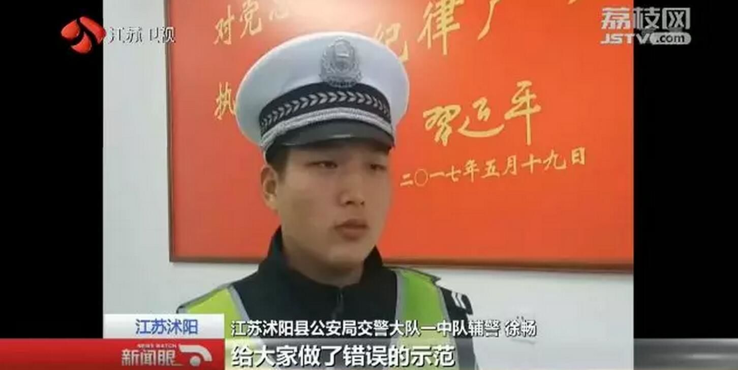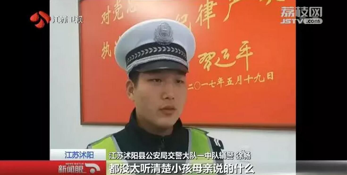 沭阳县公安局交警大队一中队辅警徐畅回忆:“当时情况紧急,我什么也没想,都没太听清楚小孩母亲说的什么,就听到要送去医院,我一把抱过来就开始跑。”