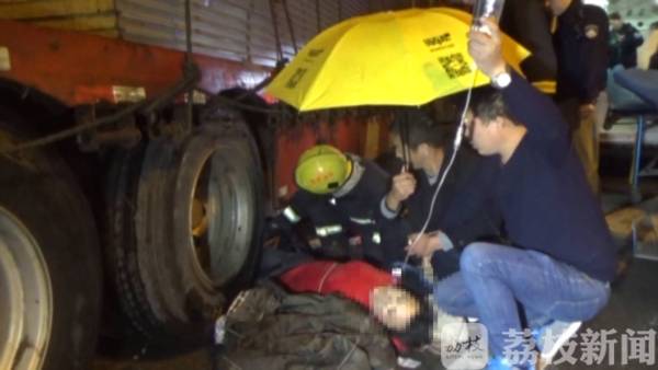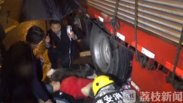 事故现场,只见一辆电瓶车正卡在货车车厢下,电瓶车女车主左腿被卡在变形的电瓶车与货车后轮之间无法动弹。先期赶到的医护人员对女车主进行紧急输液保持其生命体征,现场的热心群众给被卡女车主打伞避雨。消防员们正在利用液压破拆工具对变形的电瓶车进行破拆营救。