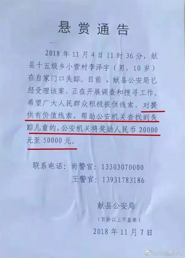 11月7日,献县公安局发布悬赏通告,希望广大人民群众积极提供线索。对提供有价值线索,帮助公安机关查找到失踪儿童的,公安机关将奖励人民币20000元至50000元。