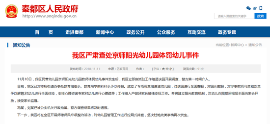 新京报快讯 据咸阳市秦都区人民政府官网消息,11月10日,秦都区民营幼儿园京师阳光幼儿园教师体罚幼儿事件发生后,秦都区立即指派驻工作组赴该园开展调查,警方第一时间介入。