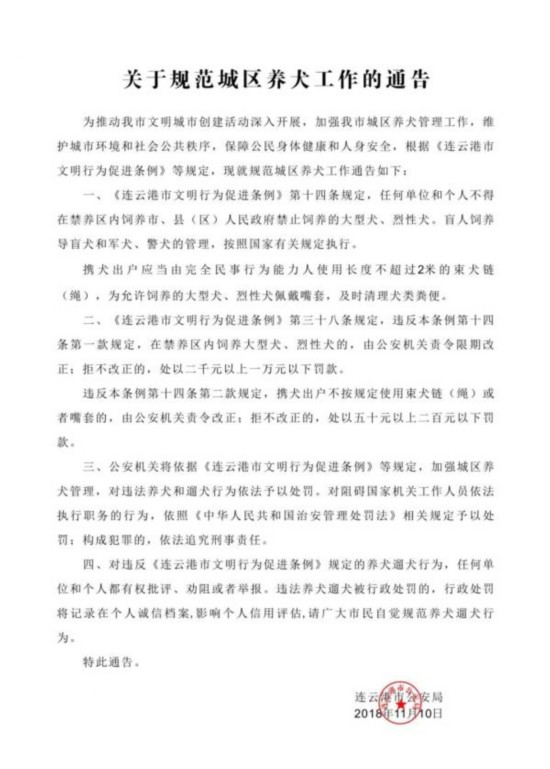 连云港警方发布城区养犬规范