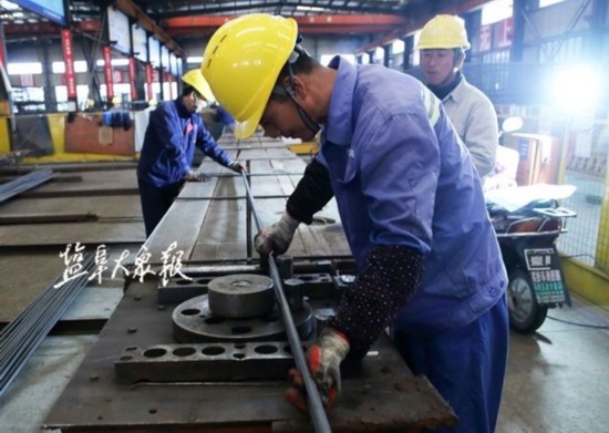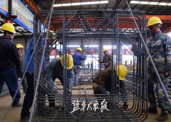 △紧张忙碌的钢筋构件加工场。