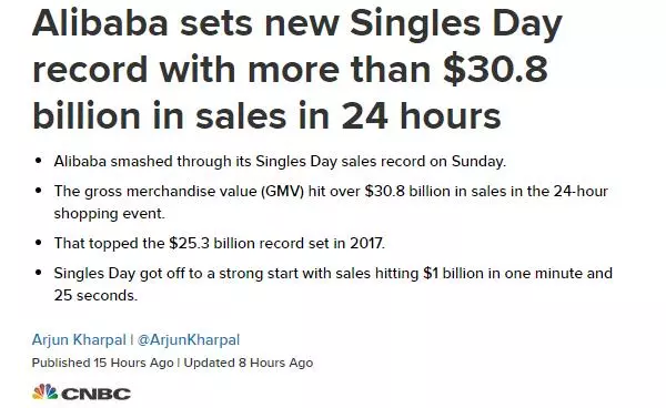 “11月11日是一切购物纪录被打破的日子。”美国互联网媒体CNET网站以“2018年黑色星期五与中国光棍节相比微不足道”为题称,“黑色星期五”和“网络星期一”是伟大的发明,因为我们可以以更低价格疯狂购物。但你知道什么更胜一筹吗?那就是中国的“双11”购物狂潮。文章称,中国“双11”比美国“黑色星期五”和“网络星期一”的销售总和大得多,今年有18万个中国和国际品牌参加第10次“双11”购物狂欢。美国《时代》周刊网站称,去年“双11”阿里巴巴的销售额为253亿美元,相比之下,美国“黑色星期五”和“网络星期一”的总在线收入为116.2亿美元,而且阿里巴巴并不是唯一的玩家。