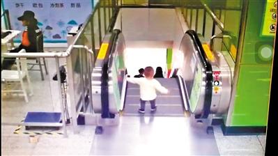 电梯继续向下,孩子双腿已悬空,还差1秒,载着他的那级台阶就要落下。