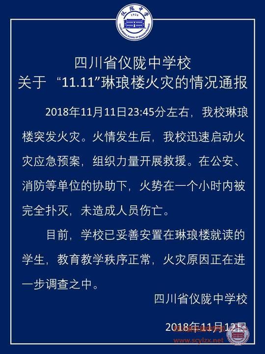12日,仪陇中学发布火灾情况通报:11日23:45分左右,琳琅楼突发火灾。火情发生后,学校迅速启动火灾应急预案,组织力量开展救援。在公安、消防等单位的协助下,火势在一个小时内被完全扑灭,未造成人员伤亡。