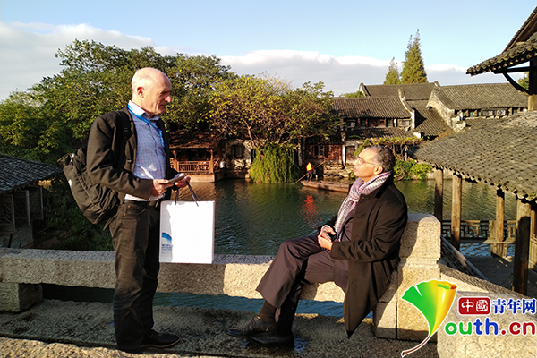 夕阳的余晖下,两位参会的外国专家在乌镇小桥上交谈。中国青年网记者 杨月摄