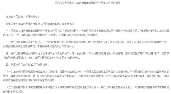 2013年2月28日,国务院正式批复海南设立博鳌乐城国际医疗旅游先行区。根据《国务院关于同意设立海南博鳌乐城国际医疗旅游先行区的批复》( 国函 [2013] 33号),将给予先行区九项支持政策,也就是后来被简称的“国九条”。其中第二条即为:先行区可根据自身的技术能力,申报开展干细胞临床研究等前沿医疗技术研究项目。