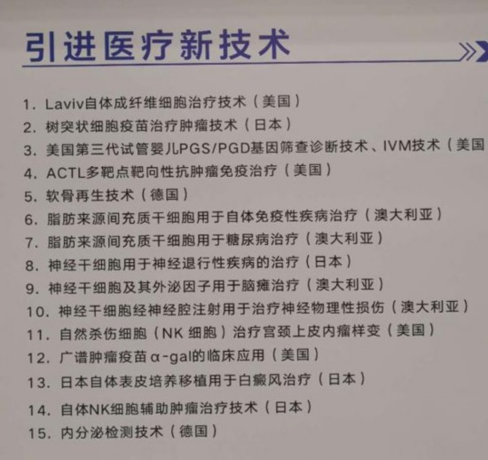 规划馆内的引进医疗新技术介绍中,也直接注明有Laviv自体成纤维细胞治疗技术、脂肪间充质干细胞用于自体免疫性疾病治疗、脂肪来源间充质干细胞用于糖尿病治疗、神经干细胞用于神经退行性疾病的治疗、神经干细胞及其外泌因子用于脑瘫治疗等。