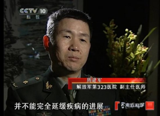 该栏目视频显示,王黎明彼时的职务为解放军323医院主任医师,同样在视频中出现的还有解放军323医院副主任医师周建军。2008年9月,一名叫秦岚的患者在323医院干细胞治疗中心接受了王黎明团队的大胆尝试。视频中提到,“来自北京的干细胞,就像一次输液,缓缓输进了秦岚的体内”。