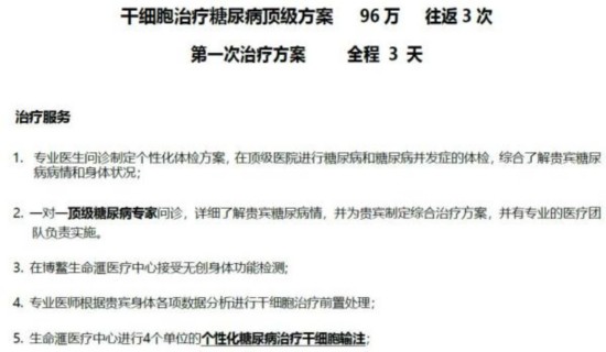 其中,“干细胞抗衰老综合治疗方案”和“干细胞治疗糖尿病方案”的报价从29.8万元/人至96万元/人不等。以所谓的“干细胞治疗糖尿病顶级方案”为例,该方案总价96万元,客户需往返3次,干细胞输注方式为静脉注射。