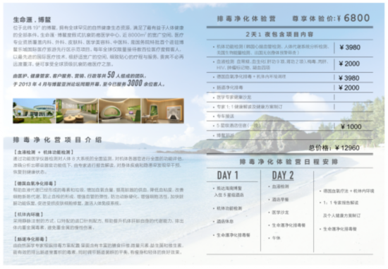 博鳌生命汇在澎湃新闻记者咨询后,最初也推荐了一款2天1夜的“排毒净化体验营”,标注“尊享体验价6800元”。体验内容包括“血液检测+机体功能检测”、德国血氧净化排毒、机体内环境、肠道净化排毒,期间还穿插医学沙龙、一对一专家报告解读等。