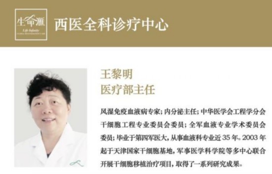 工作人员称她为“干细胞最权威的主任、全球干细胞临床治疗最丰富的人”。据该工作人员透露,王黎明在博鳌生命汇做的治疗案例已达“四五千例”。