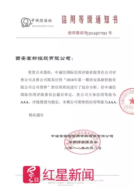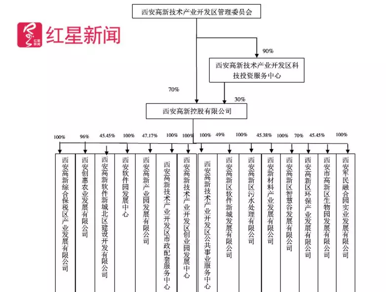 西安高新官方声明称,西安高新控股有限公司属于高新区政策性公司,由西安高新区管委会控股70%,高新区科技投资服务中心控股30%。截至2018年6月底,高新控股公司总资产1270亿元,净资产403亿元,负债867亿元,2017年公司获得政府债务置换18.74亿元。