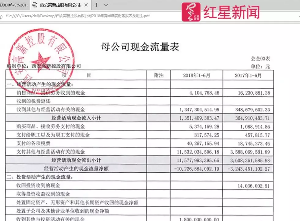 西安高新控股的母公司现金流量表中显示,2018年1-6月,支付给职工以及为职工支付的现金为317574元 截图自西安高新控股2018年半年度财报