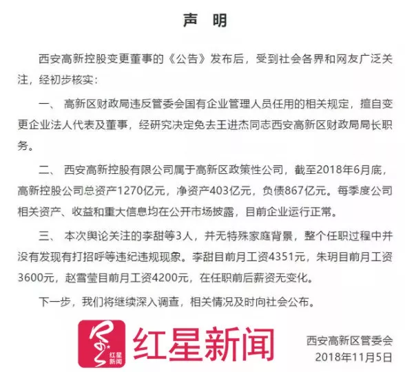 随着11月4日和11月5日西安高新官方微信号连发两则声明,回应了三人任职的质疑。声明称:李甜等三人被停职;高新区财政局违反国企管理人员任用规定,擅自变更企业法人代表及董事,局长王进杰被免职。本次舆论关注的李甜等3人,并无特殊家庭背景,整个任职过程中并没有发现有打招呼等违纪违规现象。李甜目前月工资4351元,朱玥目前月工资3600元,赵雪莹目前月工资4200元,在任职前后薪资无变化。