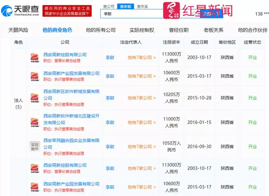 红星新闻记者注意到,李甜并非仅为高新控股一家企业的高管。天眼查显示,李甜在7家西安公司担任高管,这些公司均为高新控股投资公司,部分为全资子公司。