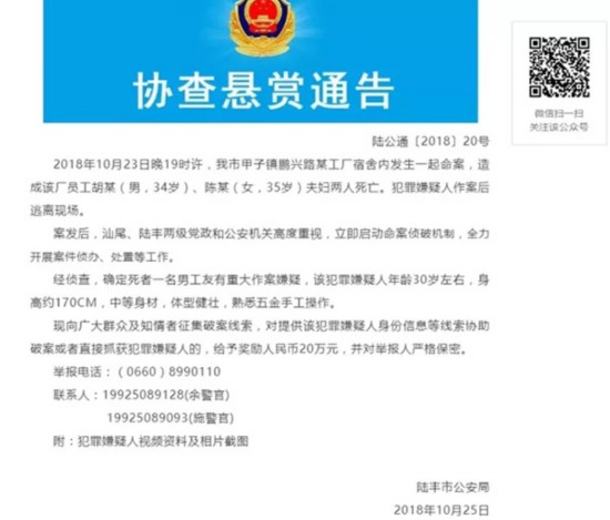 2018年10月23日晚发生于陆丰甲子某工厂宿舍致一对夫妇死亡的重大刑事案件,经公安机关全力侦查,目前犯罪嫌疑人真实身份确定!