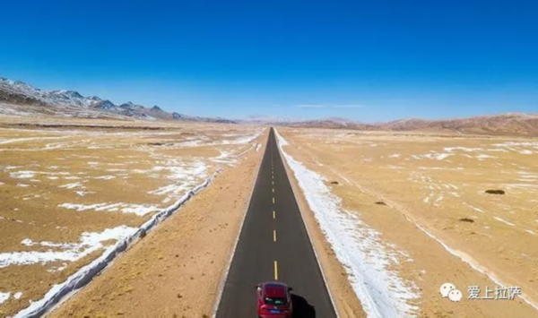 风沙四起的天路,笔直的公路将扬起沙土的天空和纯净的蓝天一分为二,像极了纪录片里才有的场景。