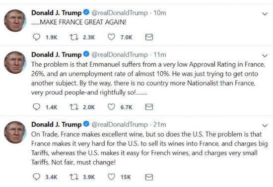 最后,目前特朗普又新发了3个网帖,一个是抱怨法国对美国红酒征收“不公平”的关税的,另两个帖子则是先嘲笑马克龙在法国的支持率下滑和法国失业率高的,然后又讽刺马克龙说法国才是最“民族主义”的国家,并疑似在煽动法国人去换掉马克龙……?