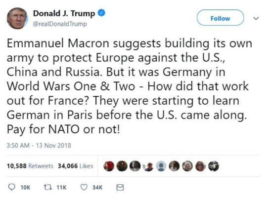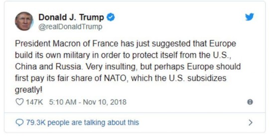 而尽管2天前特朗普就已经在自己的社交账号上发帖斥责法国总统马克龙,称马克龙的说法十分侮辱人,如今看来特朗普的气不仅没消,反而可能在法国巴黎举行的一战停战纪念仪式上被马克龙暗损他“民族主义”作风的讲话给进一步气到了,以至于他都开始公开“辱法”了,而且还是直接拿法国人最不堪回首的二战中投降的黑历史……