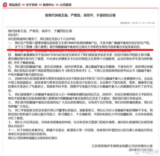 双林公司在官网强调,他们的产品,是得到了国家重点实验室—南京大学医药生物技术实验室的研究,在实验报告中,详细论述了产品可以调节细胞酸碱平衡。该实验的具体研究人员为张俊峰。