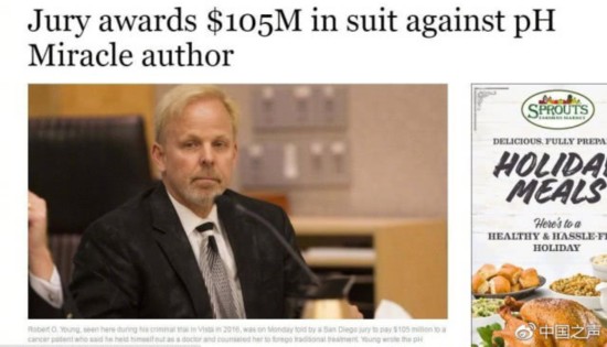 据中国之声《新闻纵横》报道:“人的体质有酸碱之分,酸性体质会导致各种疾病,甚至诱发癌症。纠正偏酸的体质,就能治愈疾病、维持健康。”这套理论,相信您肯定或多或少听说过。但是,11月2日,美国的“人体酸碱体质理论”之父罗伯特·欧·杨被美国法庭判处赔偿1.05亿美元,并当庭承认“酸碱体质理论”是个骗局。