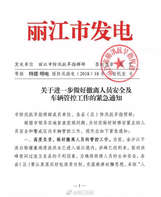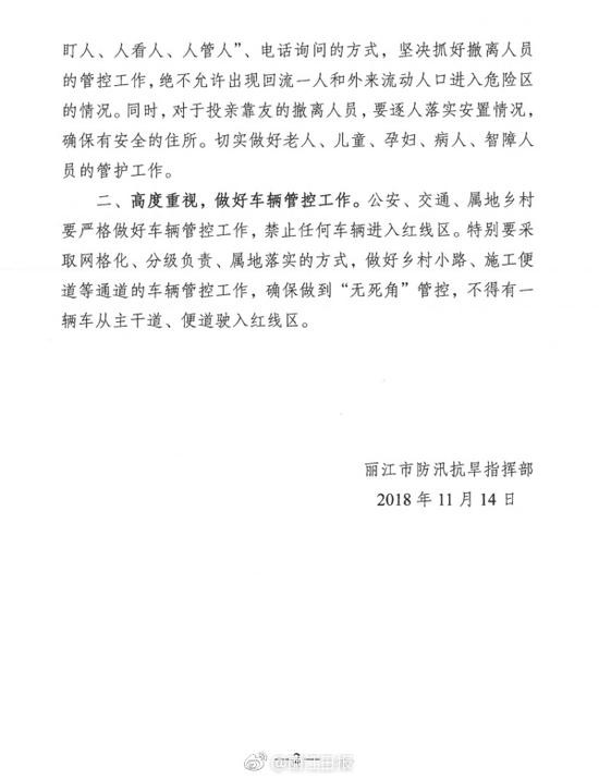 【确保安全管控“无死角”,丽江再发紧急通知】11月14日晚,云南丽江市防汛抗旱指挥部发布《关于进一步做好撤离人员安全及车辆管控工作的紧急通知》↓↓