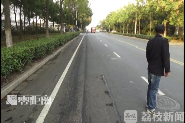 事发地点位于汉江路与昆仑路交汇处的右转弯车道,电瓶车已被清理,现场仍可以看到拖行时留下的痕迹。据目击市民说,当时骑电瓶车男子被集装箱货车刮倒后,又拖行了近200米车才停下来。