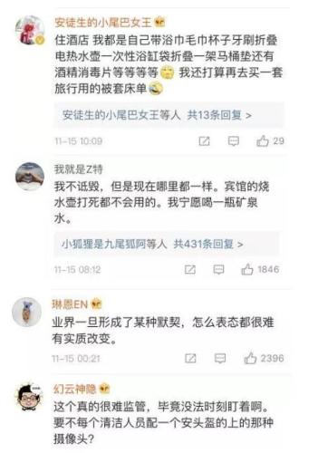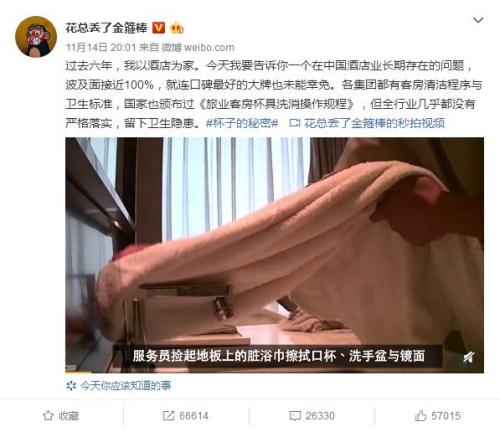 “过去六年,我以酒店为家。今天我要告诉你一个在中国酒店业长期存在的问题,波及面接近100%,就连口碑最好的大牌也未能幸免。各集团都有客房清洁程序与卫生标准,国家也颁布过《旅业客房杯具洗消操作规程》,但全行业几乎都没有严格落实,留下卫生隐患。”@花总丢了金箍棒在其微博写道。