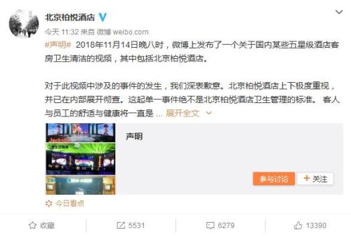 对于此视频中涉及的事件的发生,我们深表歉意。北京柏悦酒店上下极度重视,并已在内部展开彻查。这起单一事件绝不是北京柏悦酒店卫生管理的标准。 客人与员工的舒适与健康将一直是酒店工作以及关注的重中之重。我们将在酒店内部,从上到下,额外加强培训卫生标准以及管理监督制度,以确保所有的员工按照规范,有效执行。